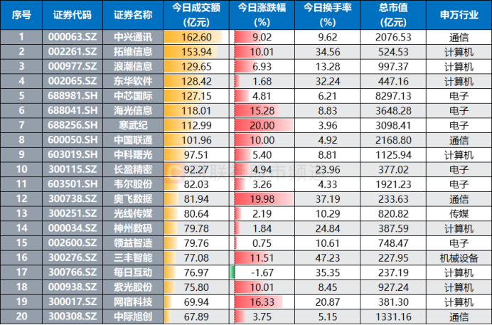 具体个股来看,筛选TMT及机械设备股,截至今日收盘,累计共有8只标的成交额在100亿元以上。其中,中兴通讯、拓维信息、浪潮信息、东华软件、中芯国际量能规模位居前五,成交额分别达162.6亿元、153.9亿元、130.0亿元、128.4亿元、127.2亿元。在这些高量成交的个股中,寒武纪、奥飞数据双双录得20cm涨停,拓维信息、中国联通、紫光股份等多股也获涨停。