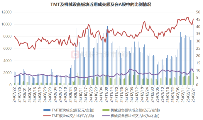 注:TMT及机械设备板块近期成交额及在A股中的比例情况(截至2月21日收盘)