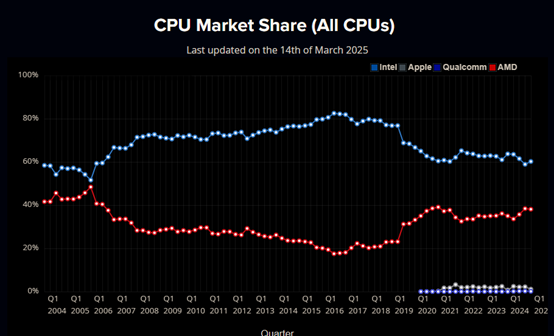 这一增长趋势在2024年尤为明显。根据市场研究机构的报告,AMD在2024年第四季度的桌面CPU市场份额达到40%,而英特尔降至60%。在笔记本CPU市场,AMD的份额也从2022年的20%增长至2024年的35%,显示出强劲的增长势头。