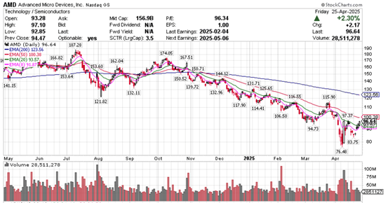 本期我们将为大家带来美股最强五十股第四支——超威半导体公司(AMD)。除了所谓的Magnificent 7,在这一波科技股浪潮中,AMD可能是比较受人瞩目的一支科技股了。特别是和英伟达(NVidia)相爱相杀的关系让它成为了很多关注芯片和AI行业投资者的选择。该股也是一度伴随着人工智能带动的芯片股行情,在2024年3月创下211.38美元的历史最高收盘价。当然,最近随着美股市场在特朗普上台以后发出的一连串关税威胁之下大幅跳水,AMD的价格也是重新回到了100美元左右的档位,较之历史最高点已经遭遇了腰斩。