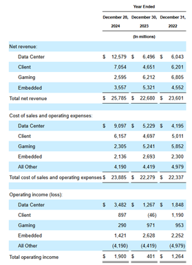 虽然AMD在数据中心业务上目前尚未达到与英伟达比肩的地位,但其在这一领域的积极拓展为未来股价增长提供了有力支撑。2024年,AMD数据中心业务收入达到126亿美元,同比增长94%,显示出强劲的增长势头。