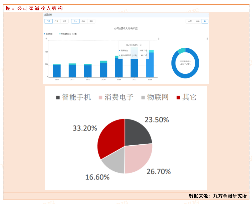 公司成立以来,一直专注于晶圆代工主业,到2023年,公司实现总收入452.5亿,实现净利润48.23亿。公司主要业务收入来自于智能手机类、消费电子类、智能家居类、其他业务。智能手机、消费 电子、物联网和其他类别占比分别为 23.5%,26.7%,16.6%和 33.2%。分区域看,公司主要业务集中在国内,中国区(内地+香港)、美国区以及欧亚区 在主营业务收入中的占比分别为 74.20%、20.80%、5.00%。在美国等欧美国家的制裁下,高端制成(7nm以下)晶圆代工目前只有台积电可以生产,中芯国际作为国内最新进的晶圆制造企业,一方面受益于美国制裁下,国产替代逻辑,公司收入这块稳步增长。另一方面,受益于国内下游客户对先进制裁国产化的渴望,随着公司技术的不断突破,未来几年突破到7nm,和5nm是大概率事情,一旦突破技术封锁,公司的成长空间巨大。