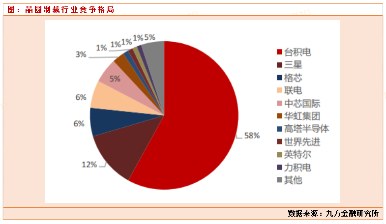 TRendForce 于 2023 年 12 月发布第三季度全球前十大晶圆代工厂排名,其中台积电以 57.9%的市场份额继续排名第一,市场份额占比相较二季度提升 1.5 个百分点。中芯国际以 16.2 亿美元的营收排名第五,环比提升 3.8%,市场份额占比为 5.4%。排名第二、第三、第四的公司和占比分别为三星 12.4%、格罗方德 6.2%、联电 6.0%,中芯国际的市场份额占比相较于格罗方德和联电的份额差距不到一个点。 目前晶圆代工制造行业,依旧属于寡头垄断阶段,台积电一家独大,占据市场份额的一半以上份额,但是中芯国际市场份额提升数据较快,市场份额不断提高。随着未来公司技术节点的突破,公司的市场份额也会快速扩大。