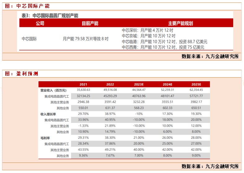 半导体晶圆制造从21世纪以来,已经逐步从日韩向中国转移,中国大陆积极布局晶圆代工产能, 根据 SEMI 统计,2021-2023 年间全球投产晶圆厂总数预计达 84 座,投资超 5000 亿美元,其中中国大陆新建 20 座成熟工艺工厂,新建晶圆厂数量为全球第一,IC Insights 预计 2026 年中国大陆晶圆产能占全球总产能将从 20 年的 15.3%升至 25%,12 英寸晶圆厂月产能将达到 240 万片。中芯国际在上海、北京、天津、深圳建有三座 8 英寸晶圆厂和四座 12 英寸晶 圆厂,在上海、北京、天津各有一座 12 寸晶圆厂在建中。目前中芯国际在中国上海建有一座 200mm 晶圆厂,以及一座拥有实际控制权的 300mm 先进制程合资 晶圆厂;在北京建有一座 300mm 晶圆厂和一座控股的 300mm 晶圆厂;在天津和深圳各建有一座 200mm 晶圆厂。目前中芯国际产能折合 8 英寸月 产能达到 79.58 万片,产能利用率在新产能逐步释放的情况下达到 77.1%。机构预期公司营收有 望 在 2024 年 逐 步 恢 复 增 长 , 预530亿左右,同比增长分别18%。实现净利润40-50亿。