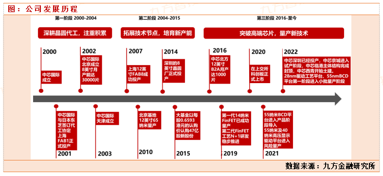 中芯国际于 2000 年在上海浦东开工建设,2001 年公司上海 8 英寸生产基地建设完成,2002 年实现 0.18μm 制程的技术认证和量产,2003 年收购天津摩托罗拉晶圆厂并成立中芯天津,公司陆续实现 0.35 微米-0.13微米 的全面技术认证和量产,2004 年公司北京 12 英寸生产基地逐步投入生产,同年公司实现首次盈利并在香港联交所与美国纽交所上市。2005 年公司年度营业收入突破 10 亿美元,并分别在 2006 年、2009 年、2011 年顺利实现 90nm、65/55nm、45/40nm 的升级和量产。2015 年实现现 28 纳米量产,进入战略调整后的高速发展时期,分别在上海、北京、天津和深圳启动生产基地的新建和扩建。2019 年公司取得重大进展,实现 14nm 的第一代 FinFET 量产,2021 年第二代 FinFET 技术 N+1 工艺实现量产。