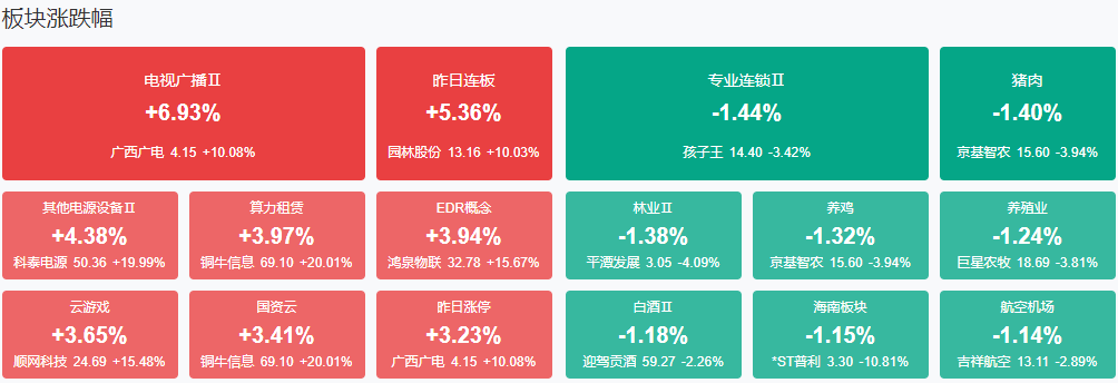 板块方面,数据中心电源、算力、国资云、影视等板块涨幅居前,猪肉、工程机械、白酒、减肥药等板块跌幅居前。截至收盘,沪指跌0.14%,深成指涨0.02%,创业板指跌0.24%。