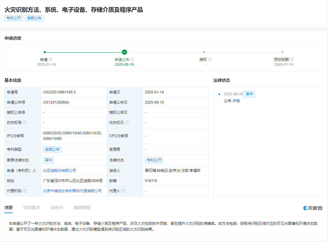 天眼查知识产权信息显示,比亚迪股份有限公司申请的“火灾识别方法、系统、电子设备、存储介质及程序产品”专利今日公布。