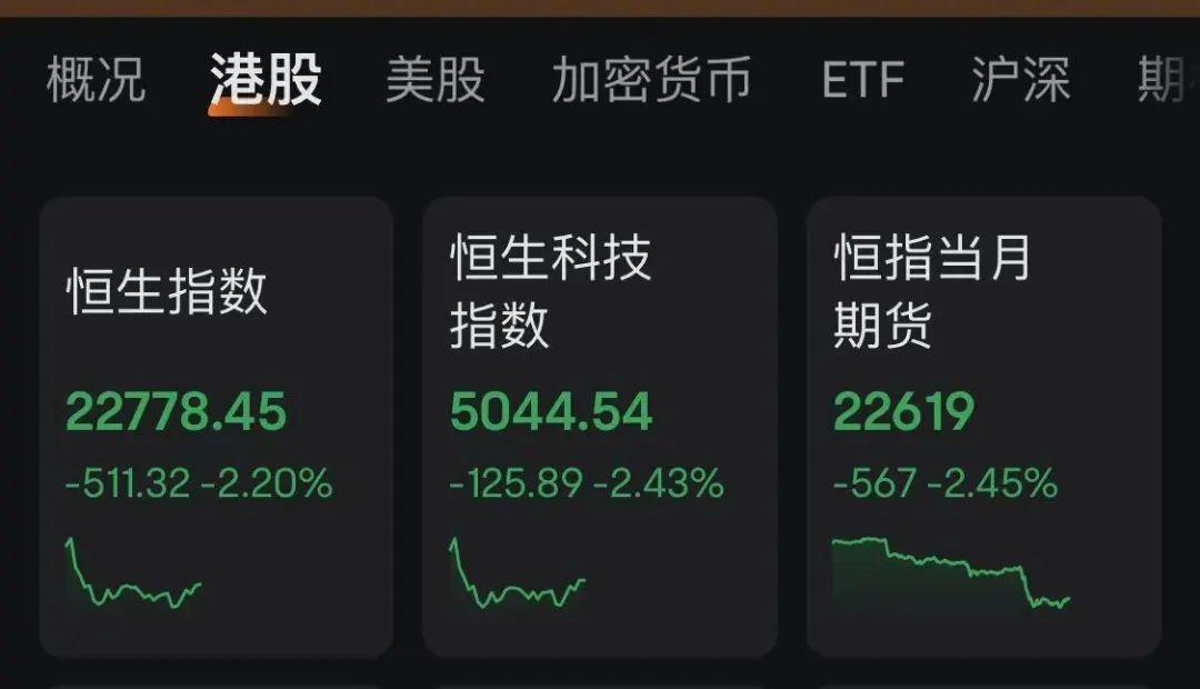 6月2日,港股主要股指早盘时段集体下挫,恒生科技指数一度跌超3%。截至午间收盘,恒生指数收跌2.2%,恒生科技指数收跌2.43%。