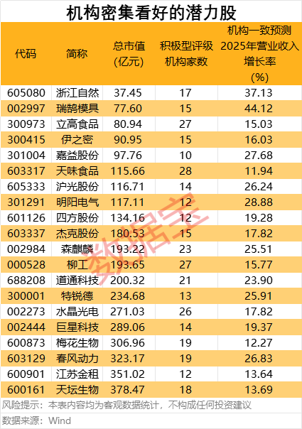 在新质生产力精选指数成份股和红利100指数成份股中,证券时报•数据宝从以下条件进行统计:包括总市值低于400亿元、最新滚动市盈率低于30倍,机构积极型评级(含“买入”和“增持”评级)家数在10家及以上且机构一致预测今年营收增长率超10%,共有20只潜力股浮出水面。