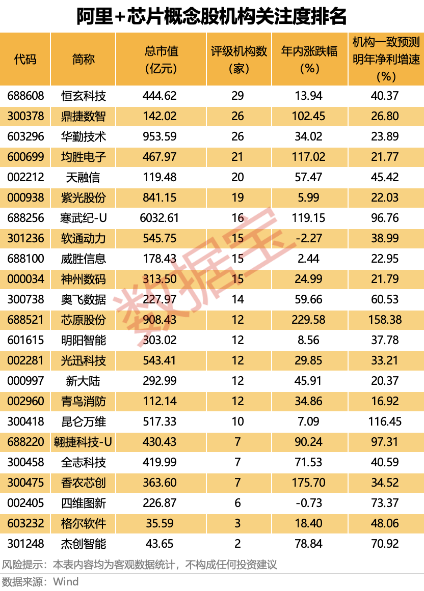 A股市场上同时具备阿里概念和芯片概念的个股,或将受益于阿里自研AI芯片的发展。