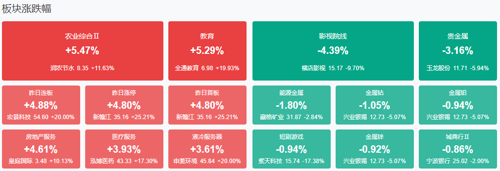板块方面,腾讯云、教育、AI医疗、AMC等板块涨幅居前,影视、贵金属、银行、固态电池等板块跌幅居前。截至收盘,沪指涨0.06%,深成指涨0.41%,创业板指涨0.61%。