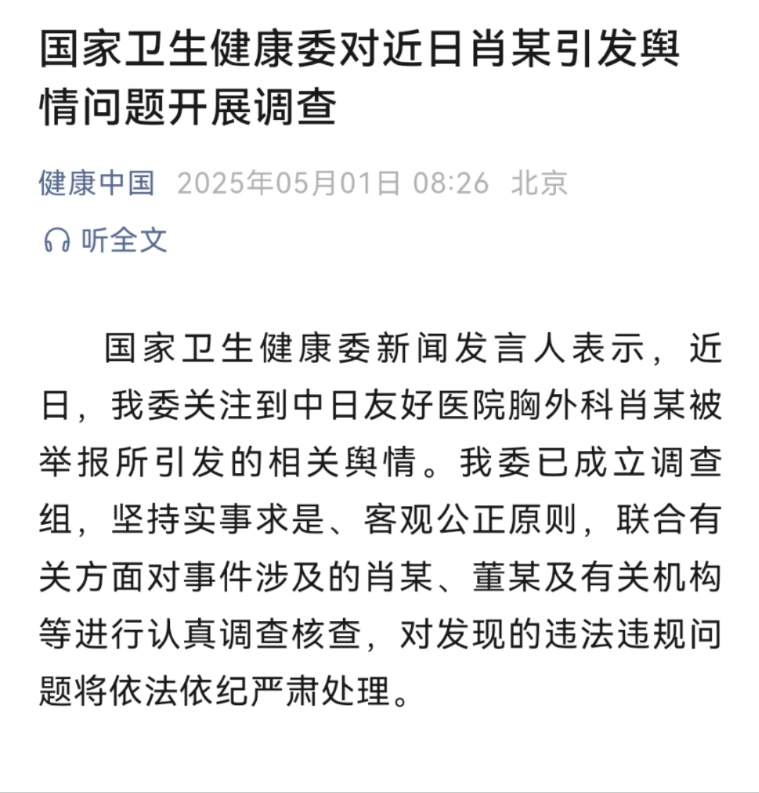 据国家卫生健康委消息,国家卫生健康委新闻发言人表示,近日,我委关注到中日友好医院胸外科肖某被举报所引发的相关舆情。我委已成立调查组,坚持实事求是、客观公正原则,联合有关方面对事件涉及的肖某、董某及有关机构等进行认真调查核查,对发现的违法违规问题将依法依纪严肃处理。