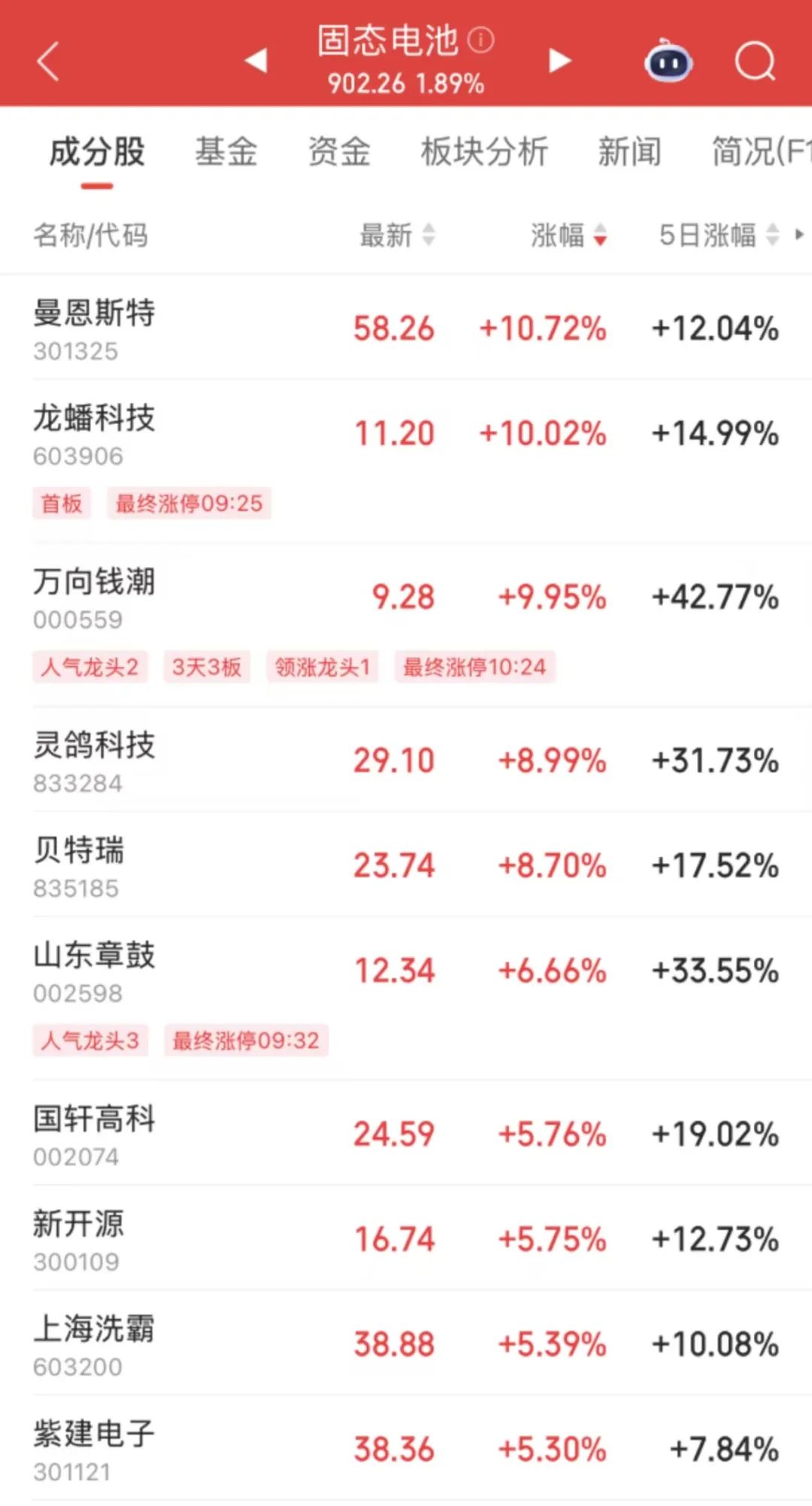 据统计,A股中固态电池概念股约有50只,年内股价平均上涨5.23%,三祥新材、上海洗霸、冠盛股份股价涨幅居前,年内均上涨超50%。