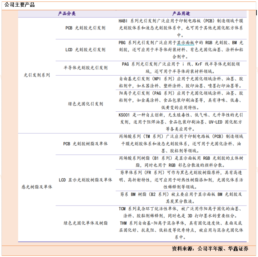 公司主营业务是光刻胶专用化学品的研发、生产和销售及相关贸易业务。光刻胶主要是由光引发剂、树脂以及各类添加剂等化学品成份组成的对光敏感的感光性材料,主要用于电子信息产业中印制电路板的线路加工、各类液晶显示器的制作、半导体芯片及器件的微细图形加工等领域。现代电子信息工业产业中大量运用光刻技术,光刻技术是人类迄今所能达到的尺寸最小、精度最高的加工技术,光刻胶是光刻技术的关键材料。各类光刻胶专用的光引发剂、树脂等化学品是组成并影响光刻胶性能的重要原料。公司主要产品为光刻胶专用化学品,分为光刻胶用光引发剂(包括光增感剂、光致产酸剂等)和光刻胶树脂两大系列。公司的产品按照应用领域分类,主要有印制电路板(PCB)、光刻胶专用化学品(光引发剂和树脂)、液晶显示器(LCD)光刻胶光引发剂、半导体光刻胶光引发剂及其他用途光引发剂(非光刻胶领域使用)四大类。