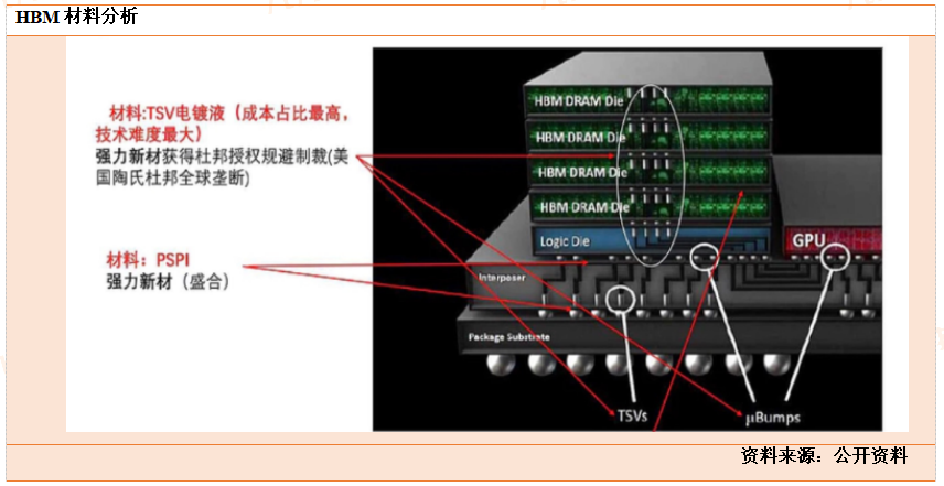 HBM的核心是先进封装,而TSV是HBM的核心。HBM工艺中,电镀、测试、键合需求提升,TSV作为HBM的核心工艺成本占比约30%,是封装成本中占比最高的部分。TSV通孔对性能至关重要。