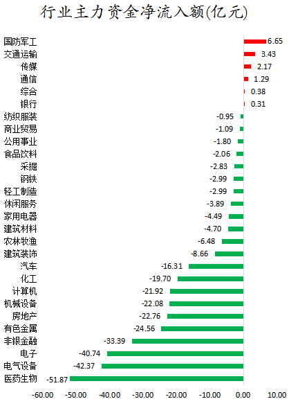 从行业板块来看,申万所属的28个一级行业,今日有6个行业板块主力资金呈现净流入,其中,国防军工行业板块主力资金净流入最多,净流入金额为6.65亿元;行业板块主力资金净流入居前的还有交通运输、传媒,净流入金额分别为3.43亿元、2.17亿元。22个行业板块主力资金呈现净流出,其中,医药生物行业板块主力资金净流出最多,净流出金额为51.87亿元;行业板块主力资金净流出靠前的还有电气设备、电子、非银金融、有色金属、房地产,净流出金额分别为42.37亿元、 40.74亿元、 33.39亿元、 24.56亿元、22.76亿元。