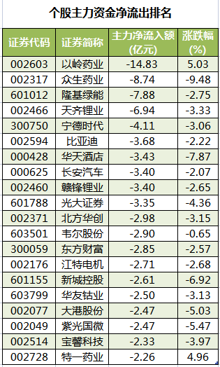 此外,3174只个股被主力资金净卖出,其中,83股被主力资金净卖出超1亿元。主力资金净流出最多的个股是以岭药业,净流出金额为14.83亿元;主力资金净流出居前的个股还有众生药业、隆基绿能、天齐锂业、宁德时代、比亚迪,净流出金额分别为8.74亿元、7.88亿元、6.94亿元、4.11亿元、3.68亿元。