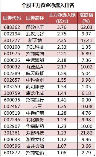 个股来看,今日有1683只个股获主力资金净流入,其中,23股获主力资金净流入超1亿元。甬矽电子获主力资金净流入最多,净流入金额为3.76亿元;主力资金净流入居前的个股还有武汉凡谷、新天地、TCL科技、招商南油、中远海能,净流入金额分别为2.75亿元、2.35亿元、2.33亿元、2.21亿元、2.18亿元。