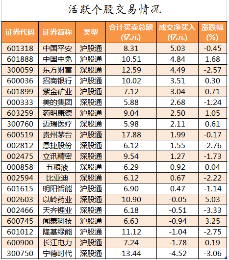 活跃个股方面,北向资金净买入较多的有中国平安、中国中免、东方财富、招商银行、紫金矿业,净买入金额分别为5.03亿元、4.84亿元、4.49亿元、3.51亿元、3.04亿元。北向资金净卖出较多的有宁德时代、长江电力、隆基绿能、闻泰科技、天齐锂业,净卖出金额分别为4.52亿元、1.78亿元、1.04亿元、0.94亿元、0.51亿元。