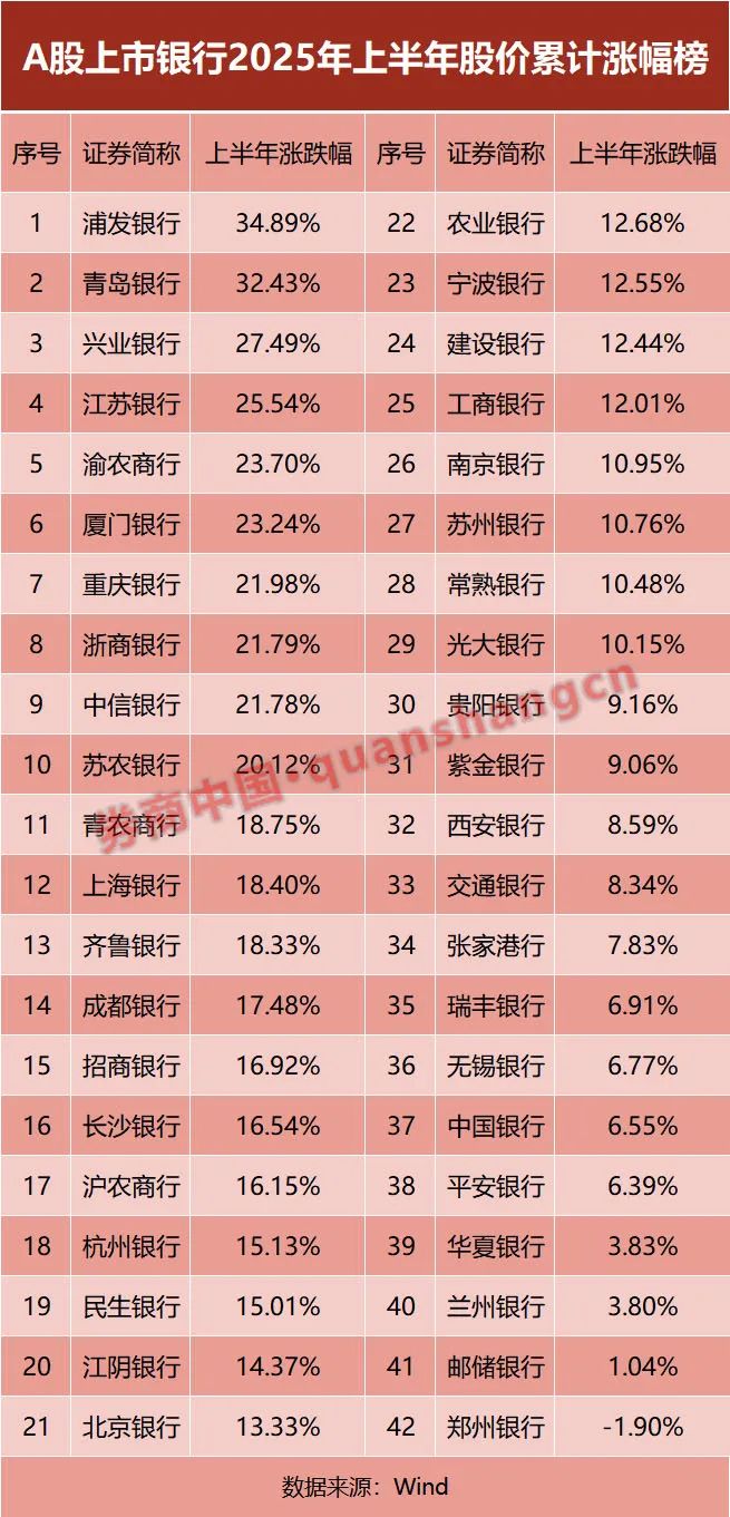 依据2025年上半年板块涨幅榜来看,浦发银行以34.89%的累计涨幅摘得桂冠,青岛银行以32.43%的涨幅紧随其后。此外,兴业银行、江苏银行、渝农商行、厦门银行、重庆银行、浙商银行、中信银行和苏农银行上半年累计涨幅均超过20%。