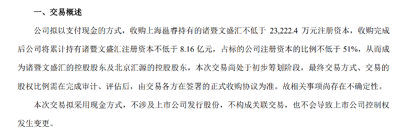 不确定性部分源于交易方持有的股权被冻结。根据公告,收购的交易对手方为上海邕睿。经查询,上海邕睿持有的文盛汇 52.47%的股权全部被深圳福田法院冻结,上海邕睿正在提起复议和执行异议。
