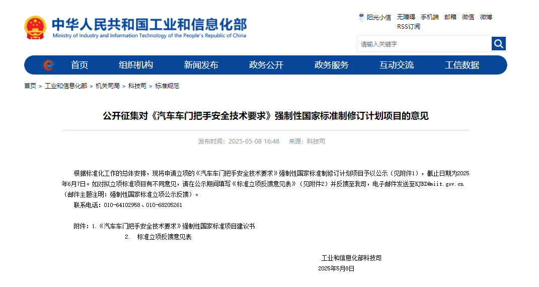 5月8日,工信部公开征集对《汽车车门把手安全技术要求》强制性国家标准制修订计划项目的意见。