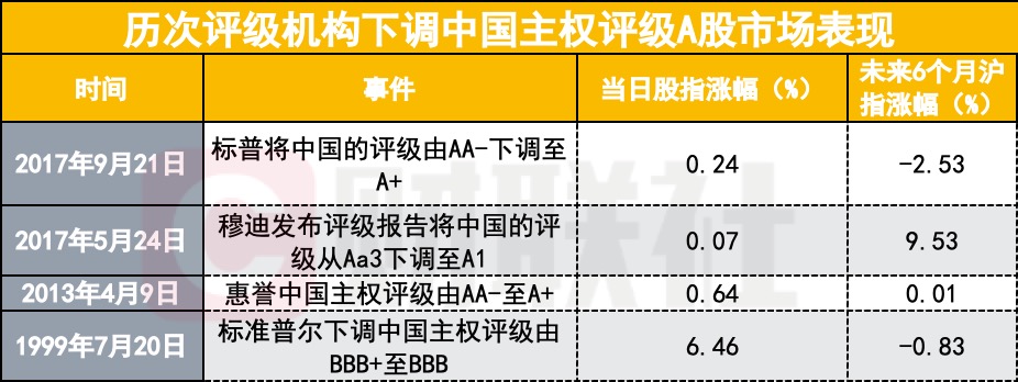 历次评级机构下调中国主权评级或展望后A股怎么走?