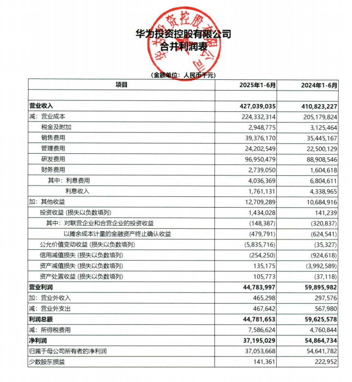 华为发布半年报,公司上半年营收达4270亿元,同比增长3.94%;净利润达371亿元,同比下降32%,低于2024年上半年的546亿元。