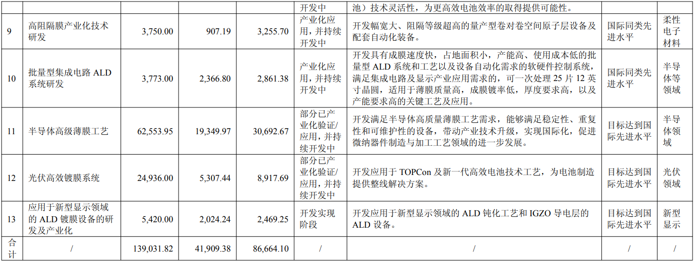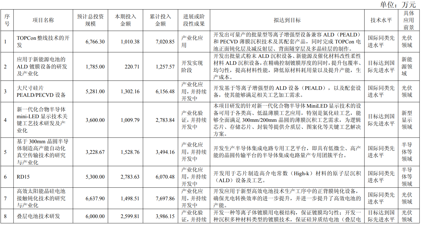 2022年-2024年,公司研发投入分别为13839.54万元、30814万元和41909.38万元,最近三年累计研发投入近86562.92万元,多年来保持高比例研发投入,其中超过60%投入半导体领域。公司半导体领域研发重点包括逻辑、存储、新型显示器、化合物半导体等项目;光伏领域研发重点包括TOPCon、XBC、钙钛矿/钙钛矿叠层电池等新一代高效电池技术等项目。