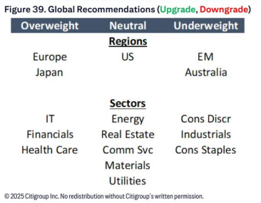 花旗发布全球经济展望与策略深度报告称,料下半年经济增长会显著放缓,这可能使今年全球经济增速降至2.4%。板块配置建议相对均衡,在成长板块(科技和周期股,通过金融股)和防御性板块(通过医疗保健超配;工业、非必需消费股低配;必需消费股防御性配置)之间取得平衡。花旗认为,黄金市场的供需缺口在2025年Q2见顶。对2025年下半年-2026年上半年的平均价格预测约为每盎司 3200-3500美元,因此强烈建议生产商针对当前价格,对价格下行风险投保。