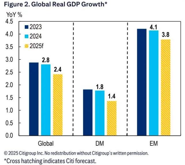 尽管有过去几年的表现,且 2025 年到目前为止也展现出韧性,但该行仍预计下半年经济增长会显著放缓。这可能使今年全球经济增速降至 2.4% (见图 2 )。