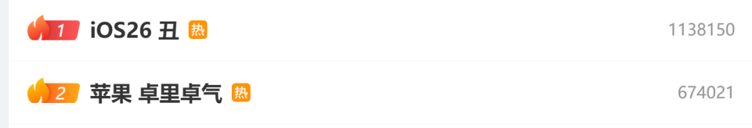 6月10日,关于苹果系统改版的讨论霸榜多平台热搜。其中,“iOS26 丑”“苹果 卓里卓气”登上微博热搜前两名。