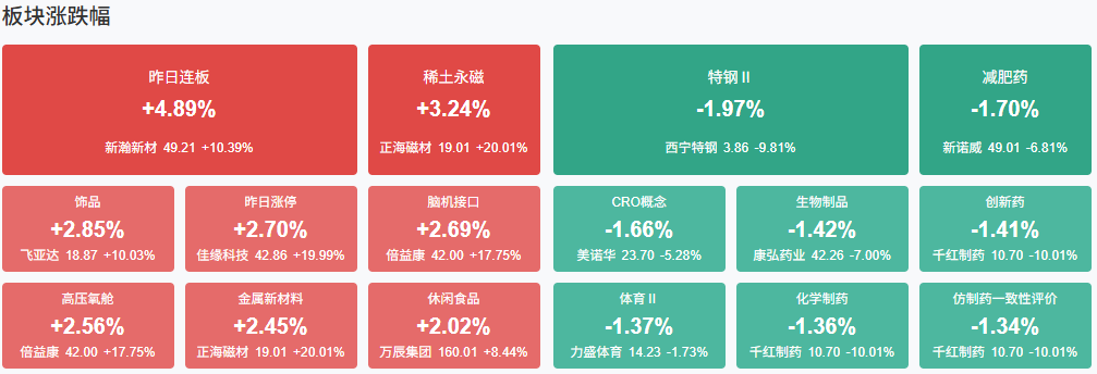 板块方面,稀土永磁、半导体、物流、医疗器械等板块涨幅居前,创新药、保险、铜箔、光伏等板块跌幅居前。截至收盘,沪指涨0.16%,深成指跌0.18%,创业板指跌0.68%。