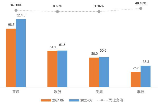 分地区来看,亚澳区域实现营收114.6亿元,同比增长16.3%;欧洲区域实现营收61.5亿元,同比增长0.7%;美洲区域实现营收50.7亿元,同比增长1.4%;非洲区域实现营收36.3亿元,同比增长40.5%。