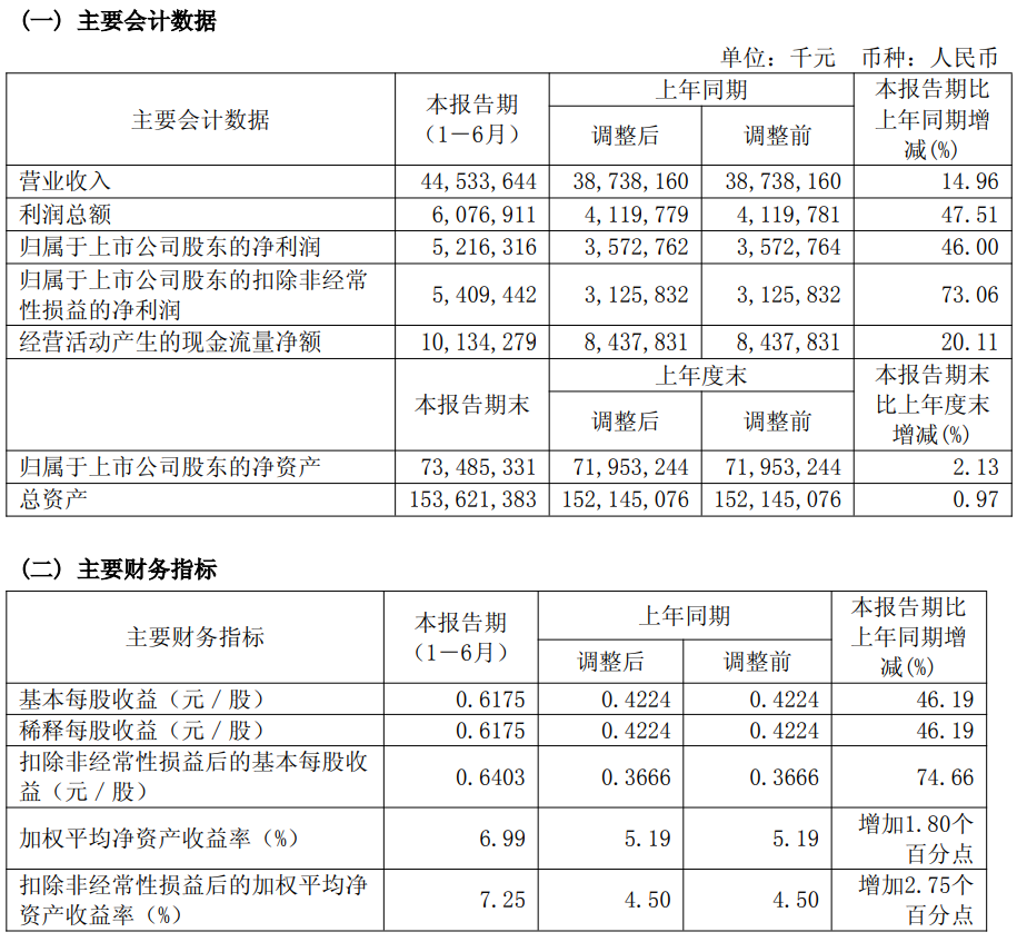 单二季度营业收入234.85亿元,同比上升11.43%;归属于上市公司股东的净利润27.45亿元,同比增长37.76%。