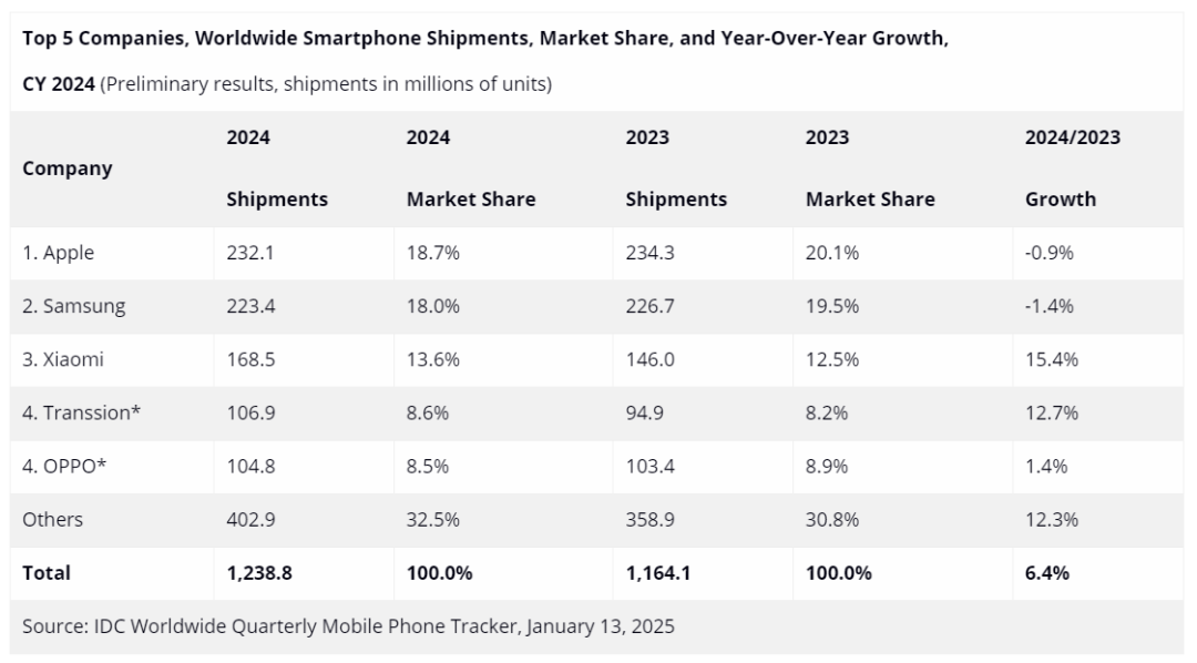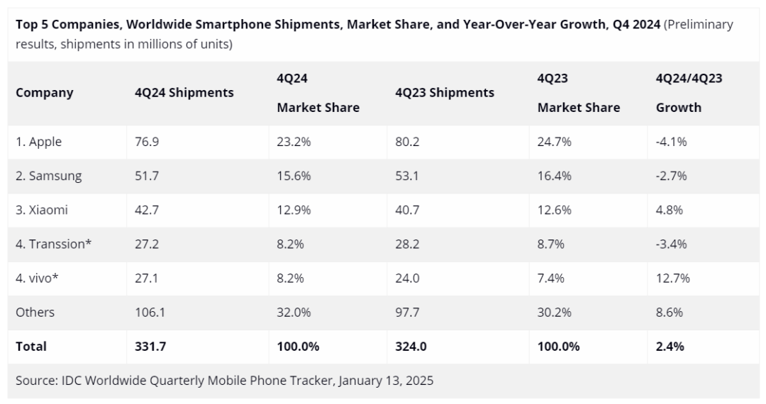 2024年第四季度全球前五大智能手机厂商市场表现: