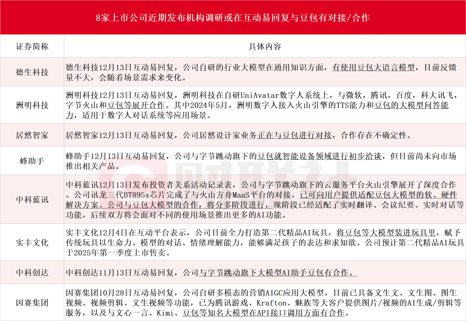 据不完全统计,截至发稿,包括德生科技、洲明科技、居然智家、蜂助手、中科蓝讯、实丰文化、中科创达、因赛集团在内的8家上市公司近期发布机构调研或互动平台回复与豆包合作的相关情况,具体详见下图: