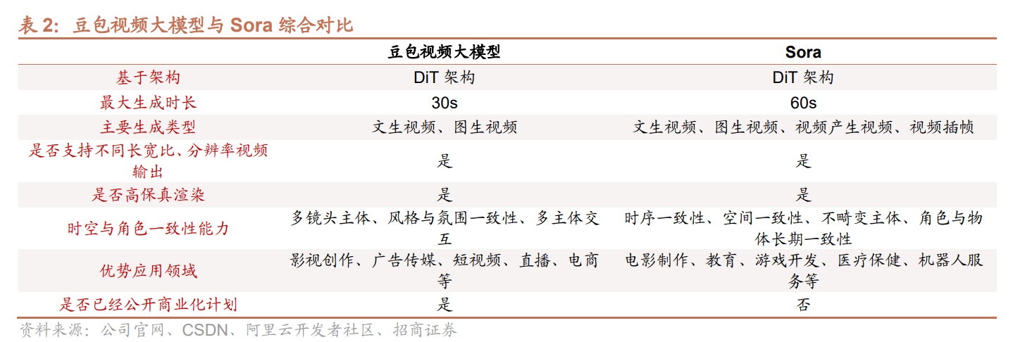 字节豆包视频大模型相较于Sora,在整体性能方面,豆包大模型有效攻克多镜头切换一致性难题,在镜头切换时可保持主体、风格与氛围一致性,并保证多主体交互能力,系豆包视频模型的专有技术创新。但在视频最大生成时长方面,豆包视频模型仍较Sora存在一定差距。在应用领域,Sora应用领域相对更加广泛,字节豆包视频大模型由于企业属性因素,在影视创作、广告传媒、短视频等领域应用优势较大。商业化与本土化方面,当前字节豆包视频大模型已经公布使用方案,同时基于自身出色的中文语义理解能力,豆包视频大模型在本土市场应用将较Sora更为广泛。