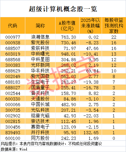 据证券时报·数据宝统计,A股市场上,涉及超级计算机业务的概念股近20只。截至5月14日收盘,概念股今年以来平均上涨10.25%,大幅跑赢同期上证指数。其中并行科技、华丰科技、索辰科技累计涨幅排在前三,均超过40%。