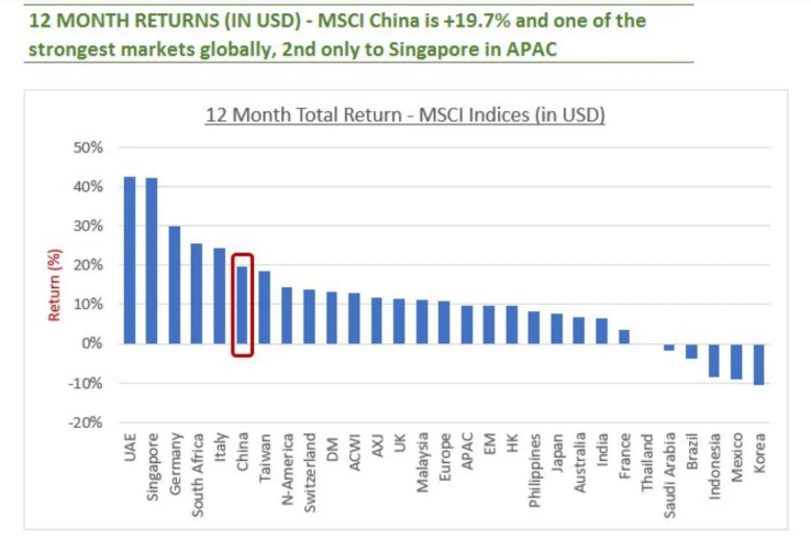 MSCI中国指数回报率为+19.7%,是全球表现最强劲的市场之一,在亚太地区仅次于新加坡。