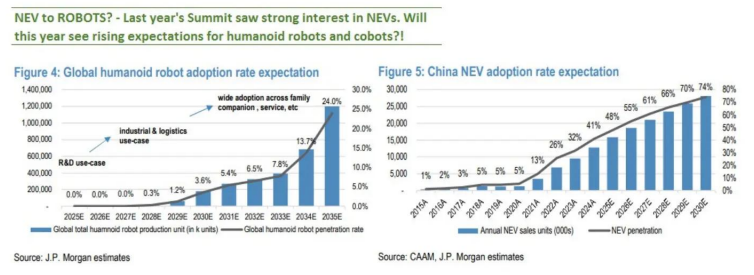 智能机器人(包括人形机器人):物流、制造业和服务业越来越多地将智能人工智能机器人视为支持其下一阶段增长的关键。优必选科技(专注于人形机器人)、Unitree(专注于人形机器人和四足机器人)和海柔创新(仓储机器人)是该领域的领先企业,也是本次峰会上值得关注的重点。摩根大通工业行业分析师Karen Li对智能机器人的发展进行了深入研究,并估计人形机器人的潜在市场规模(TAM)为50亿美元,未来五年将实现快速渗透。随着机器人企业的扩张,供应链也将迎来增长机会。Karen指出,减速器、滚轮、螺丝、传感器和电机驱动是关键部件(例如,三花智控和雷赛智能)。