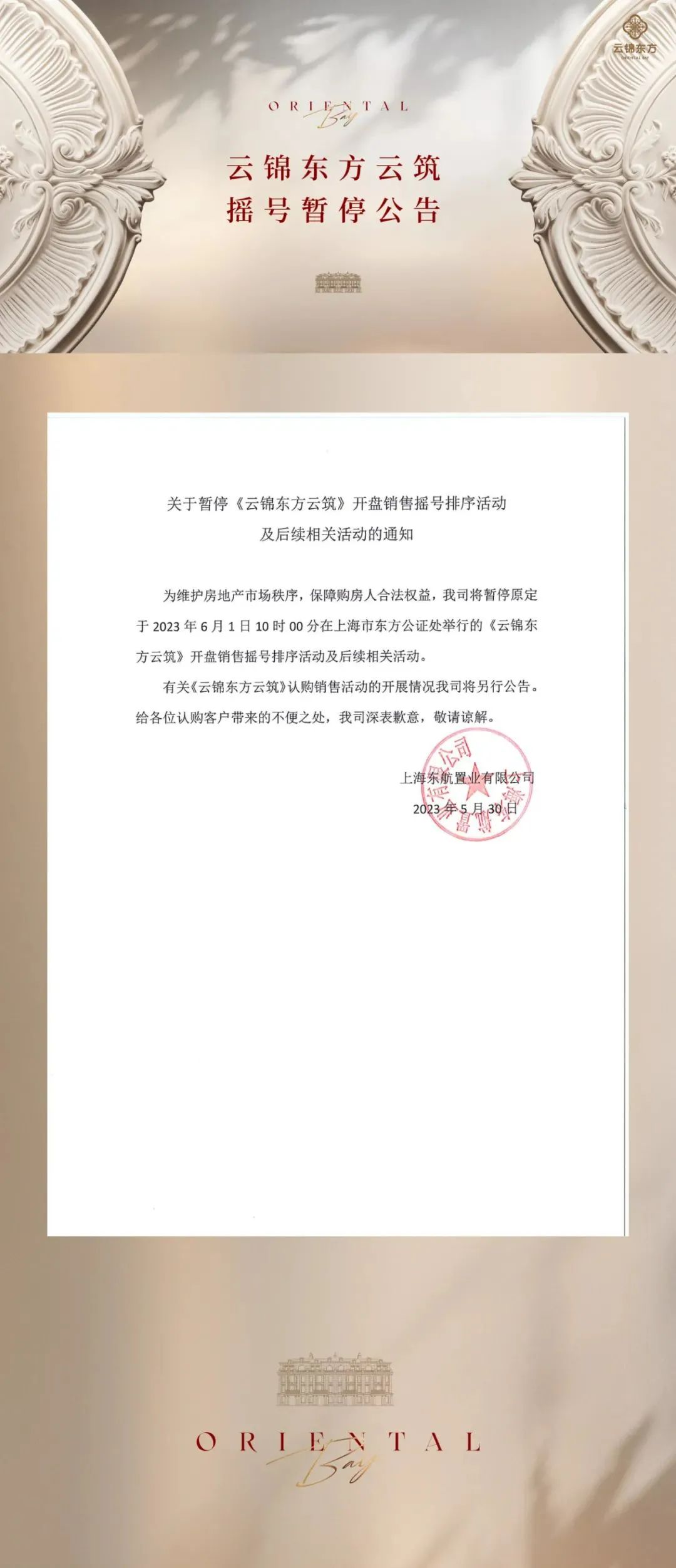 5月30日,上海东航置业有限公司通过“云锦东方”官方微信公众号发布“关于暂停《云锦东方云筑》开盘销售摇号排序活动及后续相关活动的通知”。