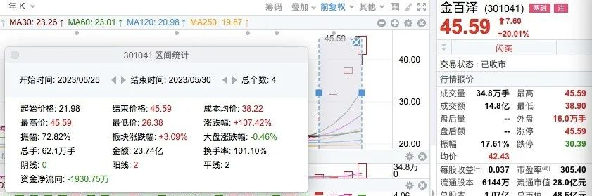 截至收盘,金百泽连续四个交易日“20cm”涨停,累计涨幅已翻倍。