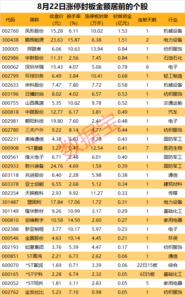 以封单金额计算,凤形股份、鹏辉能源、探路者封单金额居前,分别为1.53亿元、1.51亿元、8446.79万元。