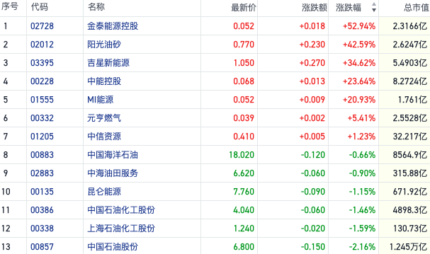 截至收盘,金泰能源控股(02728.HK)涨近50%,阳光油砂(02012.HK)涨超40%,吉星新能源(03395.HK)涨近35%。而相对而言,中石油(00857.HK)、中海油(00883.HK)等中字头反而表现较弱,这也凸显出短线行情由情绪主导。