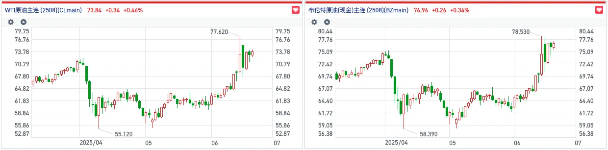 近日,以色列和伊朗均向对方的能源设施展开袭击后,直接刺激隔夜WTI和布伦特原油期货主力合约双双大涨超4%。