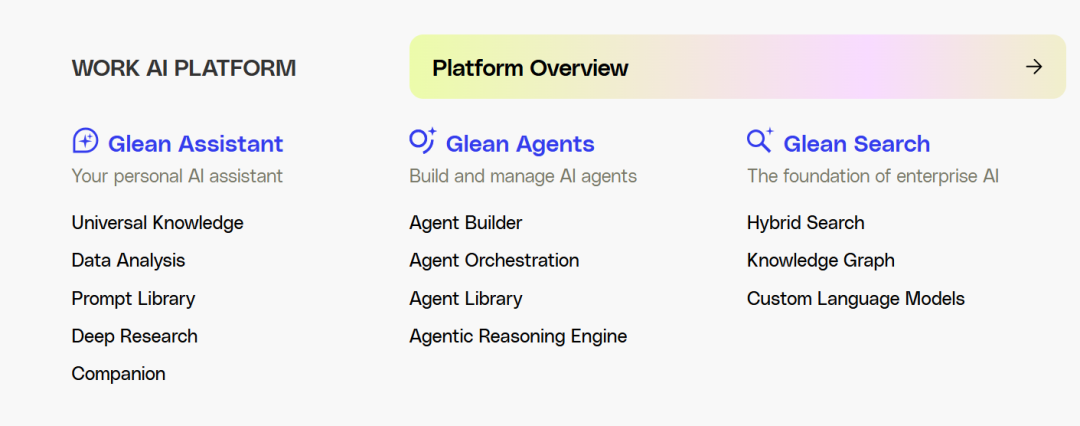 Glean成立于2019 年,从企业内部搜索开始做起,即Glean Search。在ChatGPT推出之后,Glean以基于RAG技术的企业AI搜索为核心,陆续推出Glean Assistant(Copilot)和Glean Actions(Agent)等产品。