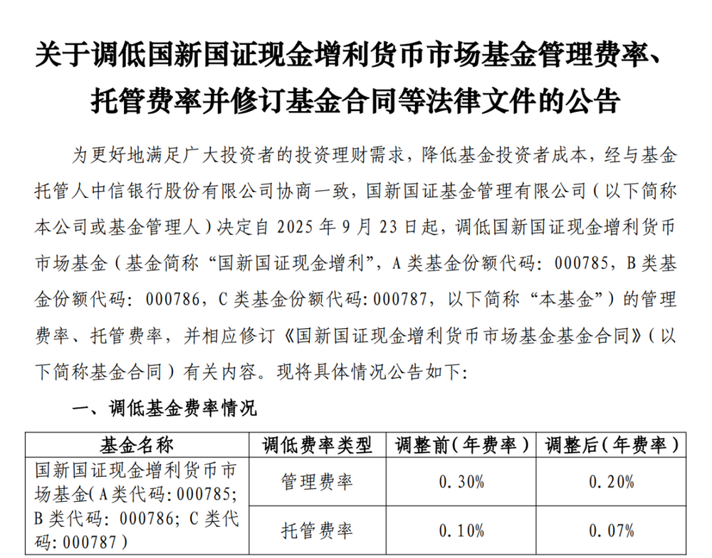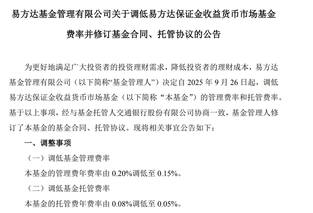 同日,还有2只货基宣布降费,且同时调降了管理费费率和托管费率。