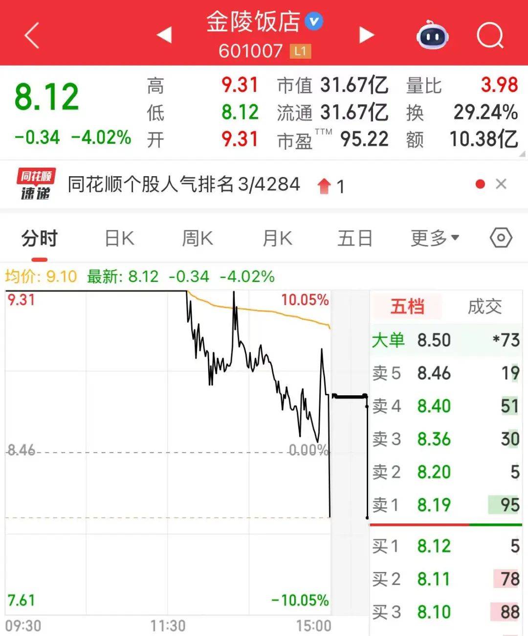 今日早间开盘,金陵饭店以涨停价开盘,早盘短暂开板后回封。午后13:13,该股涨停板再次打开,直到尾盘竞价阶段跳水,日K线收大阴线。数据宝统计显示,该股今日成交额10.4亿元,创今年以来单日新高。