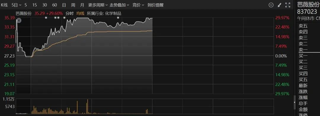 合成生物概念早间放量上攻,板块指数涨超2%,创年内新高,半日成交接近昨日全天成交。芭薇股份盘中触及30%涨停,川宁生物、洁雅股份均直线20cm封板,美农生物、福瑞达、金达威等亦涨势涨停或涨超10%。